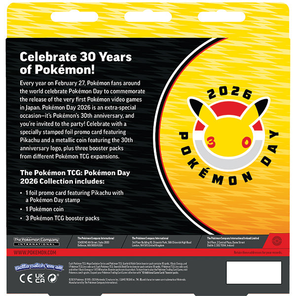 Cada año, el 27 de febrero, los fans de Pokémon de todo el mundo celebran el Día de Pokémon para conmemorar el lanzamiento de los primeros videojuegos de Pokémon en Japón. El Día de Pokémon 2026 es una ocasión muy especial: es el 30.º aniversario de Pokémon, ¡y estás invitado a la fiesta! Celebra con una carta holográfica especial de Pikachu y una moneda metálica con el logo del 30.º aniversario, además de tres paquetes de mejora de diferentes expansiones de JCC Pokémon.